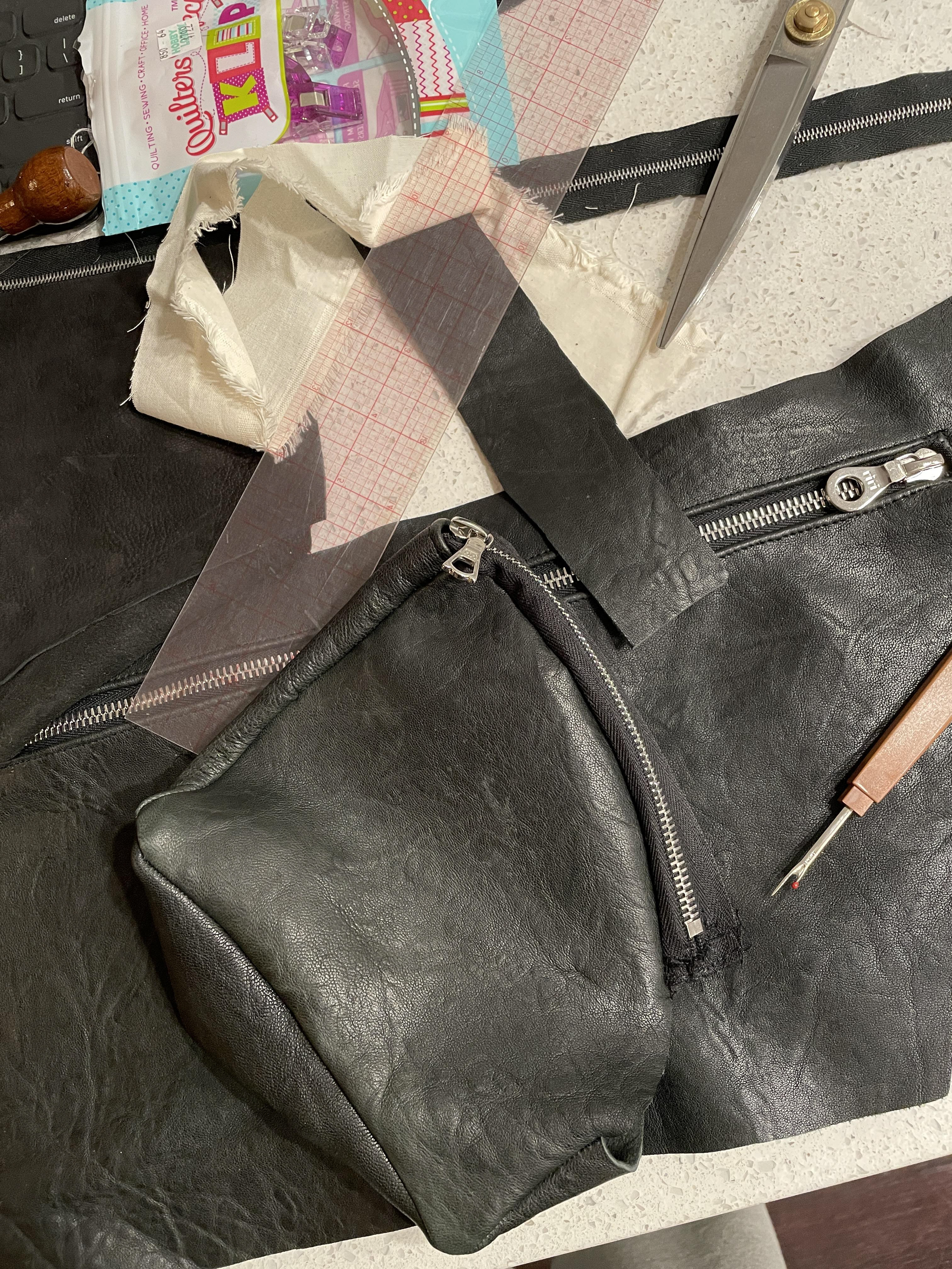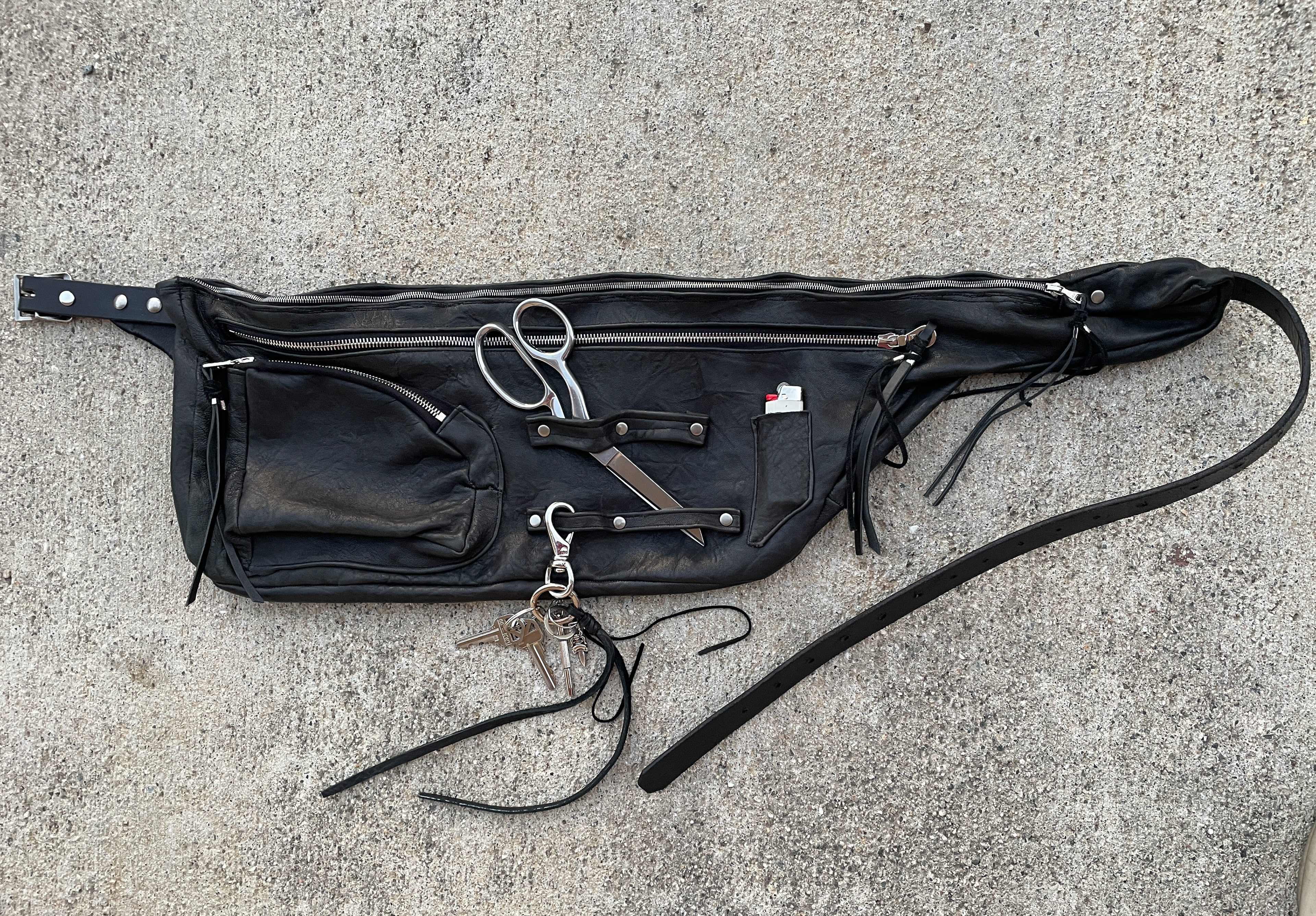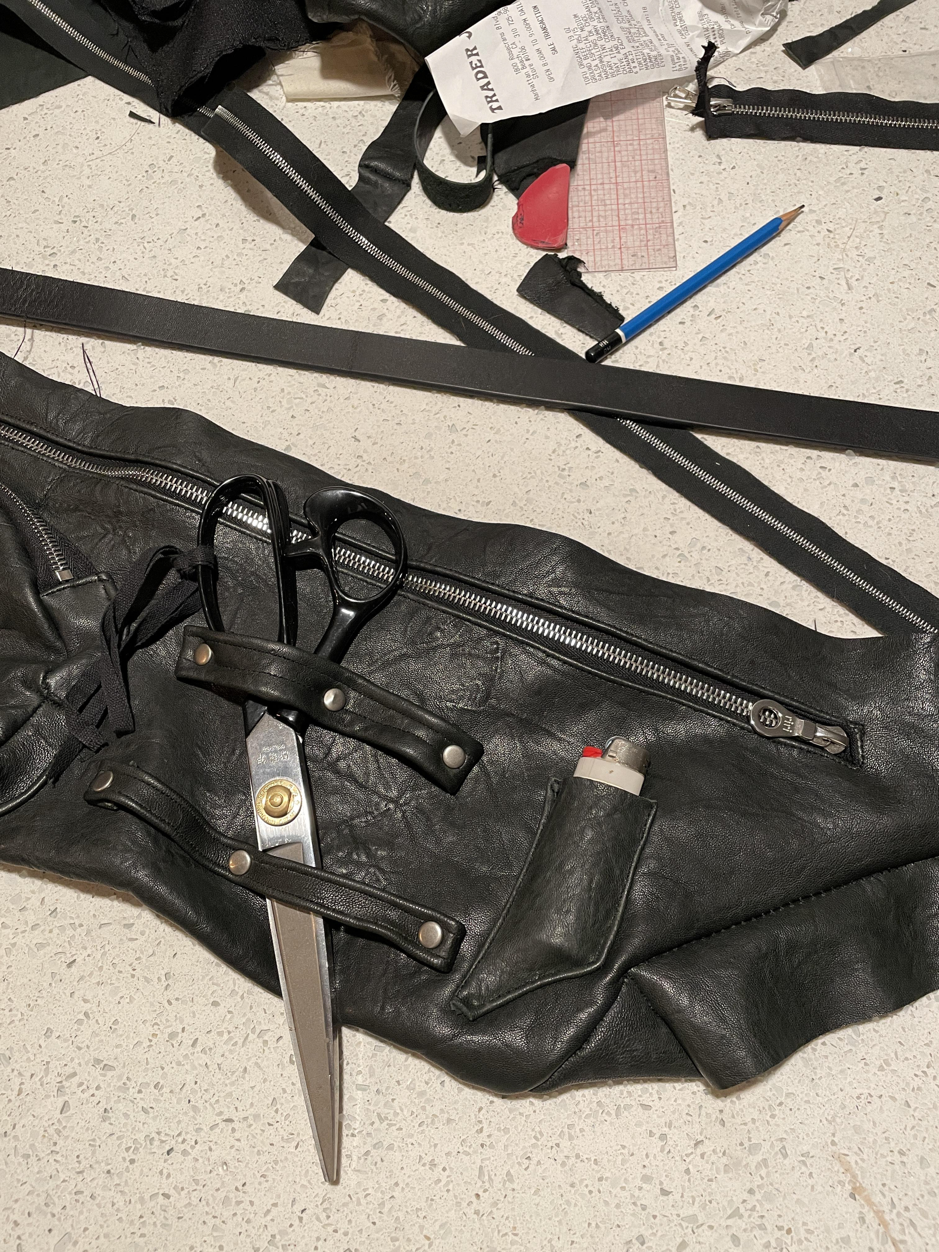 Two main storage compartments and one 3D pocket all with Riri zippers. Two size hammer/scissor hanging loops and a small pocket for thread scissors or a lighter, complete with leather tassel with .925 sterling silver details.