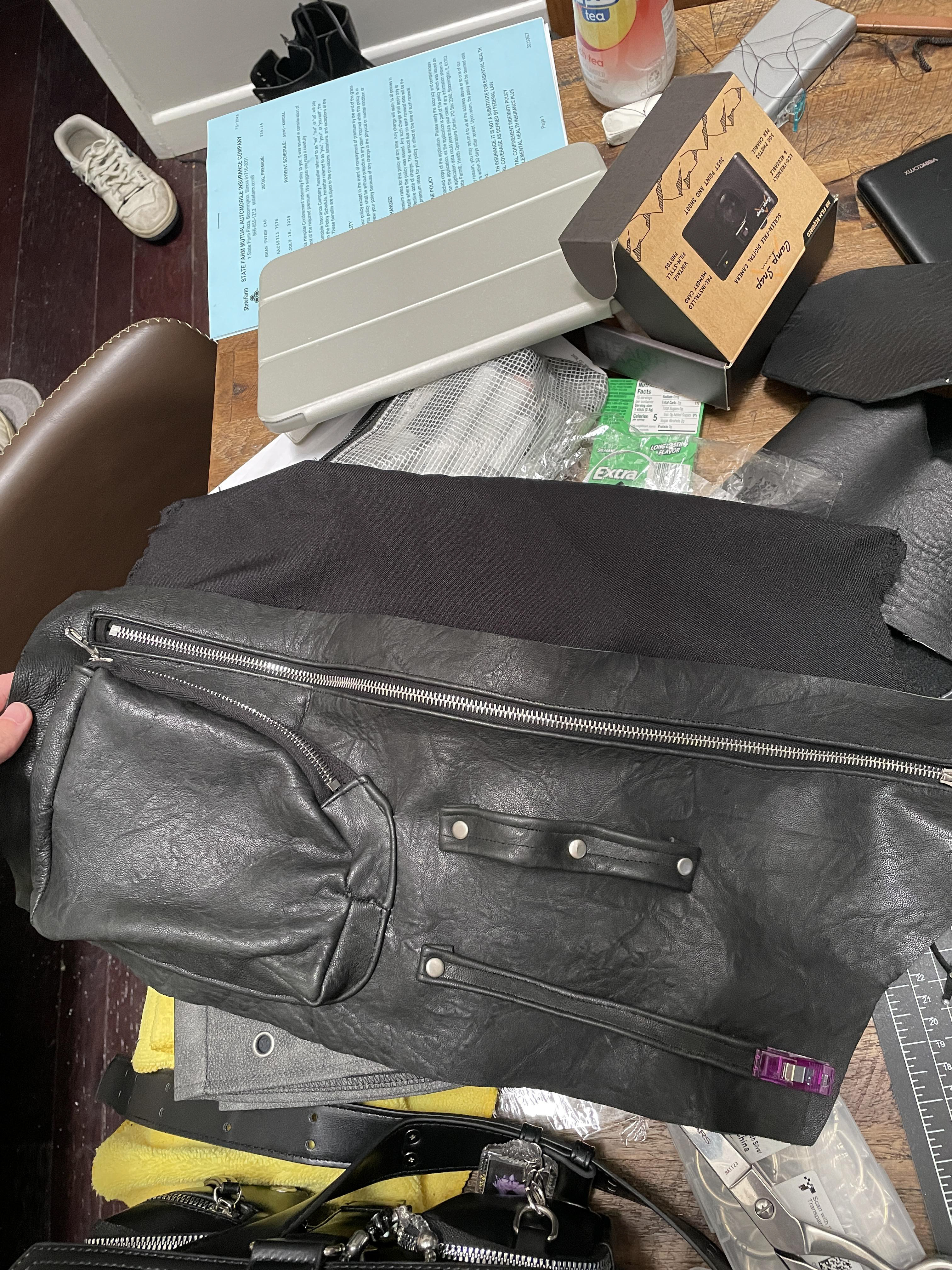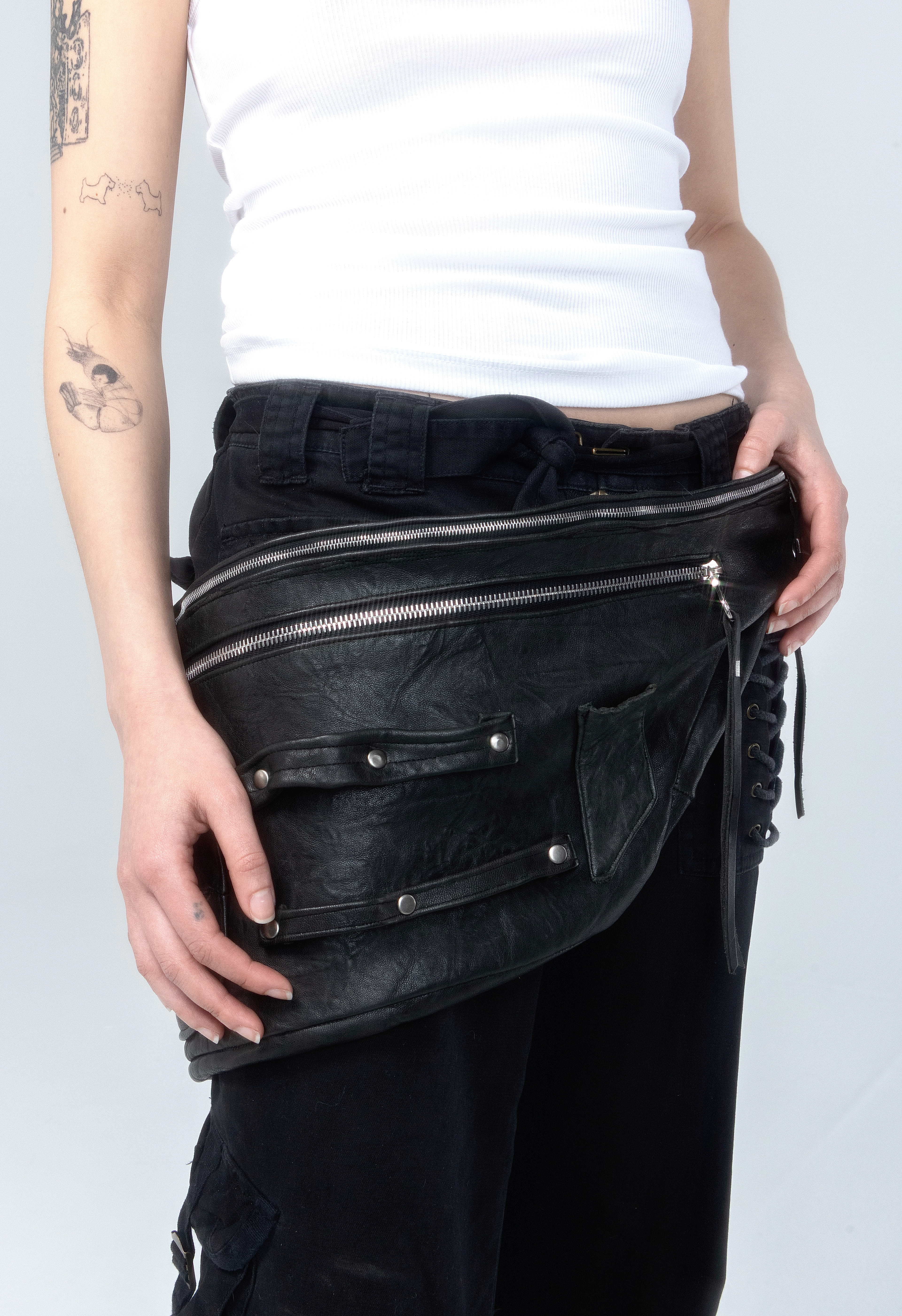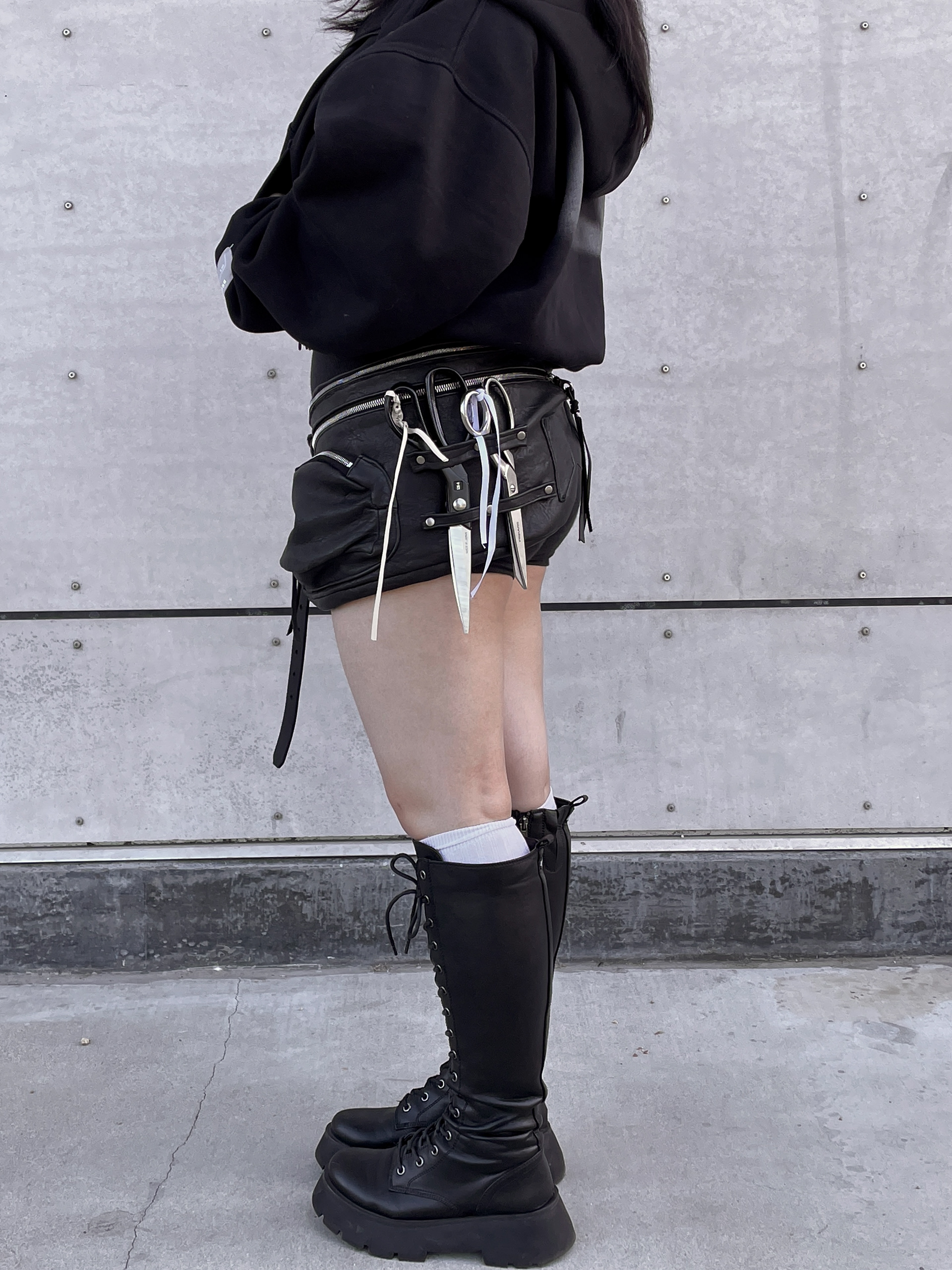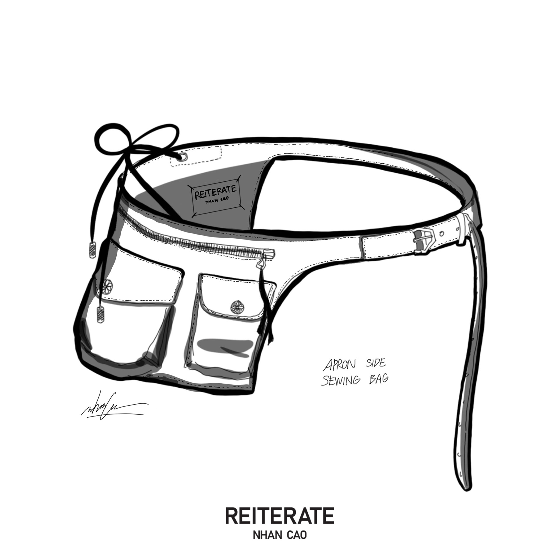 Two main storage compartments and one 3D pocket all with Riri zippers. Two size hammer/scissor hanging loops and a small pocket for thread scissors or a lighter, complete with leather tassel with .925 sterling silver details.