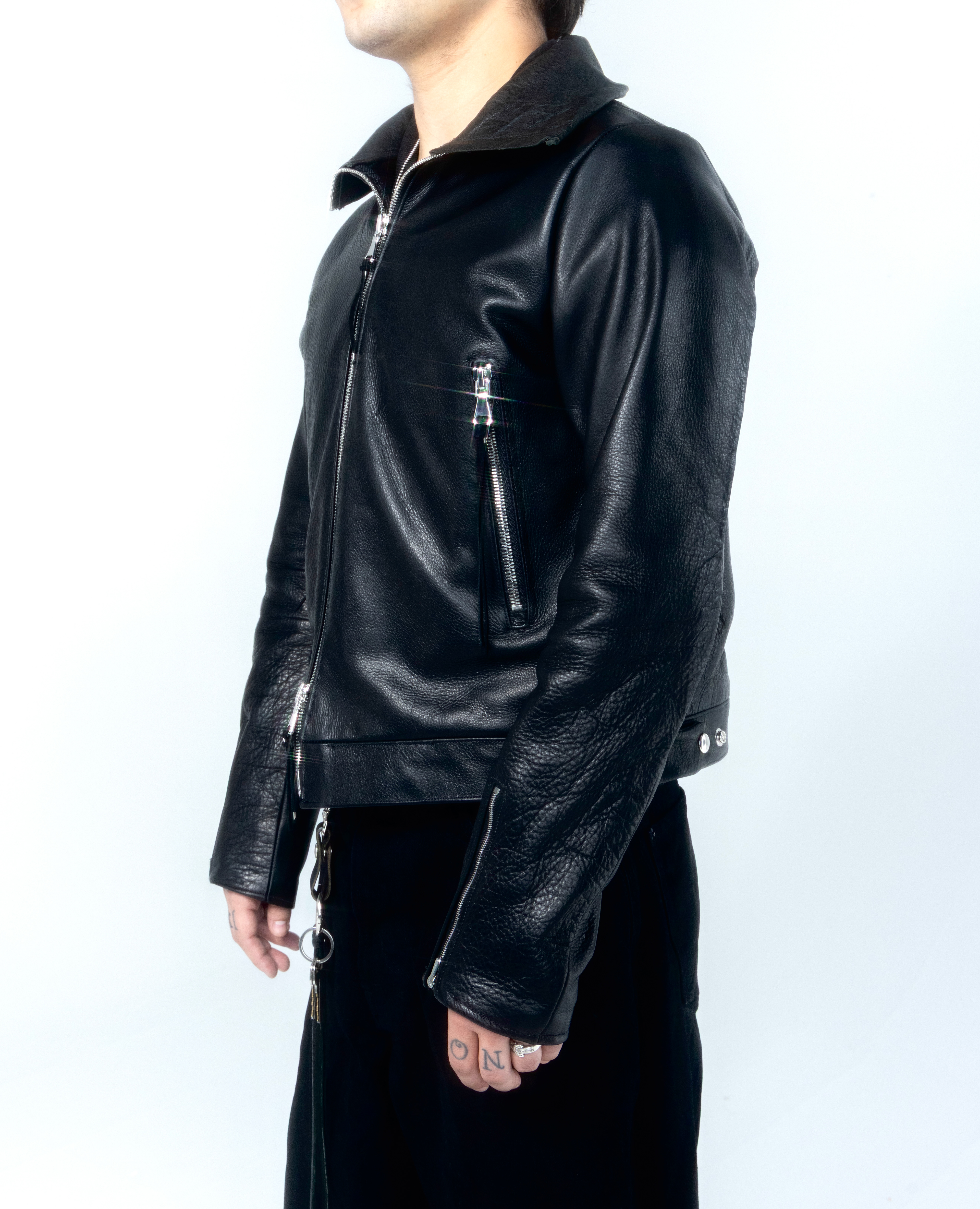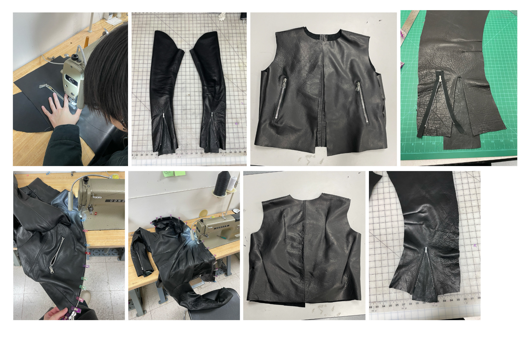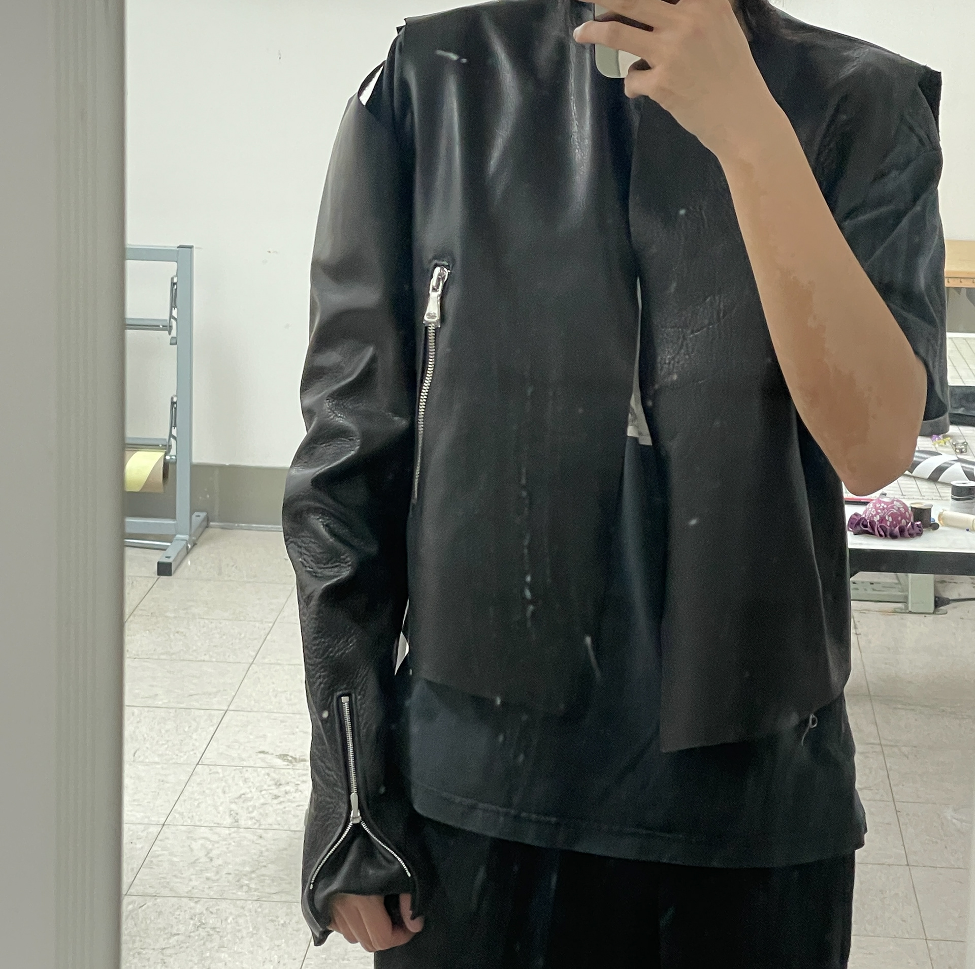 Calfskin leather, cropped body, J-cut sleeve, elongated neck, double zip, darts throughout. Design, patterned, and sewn by me.