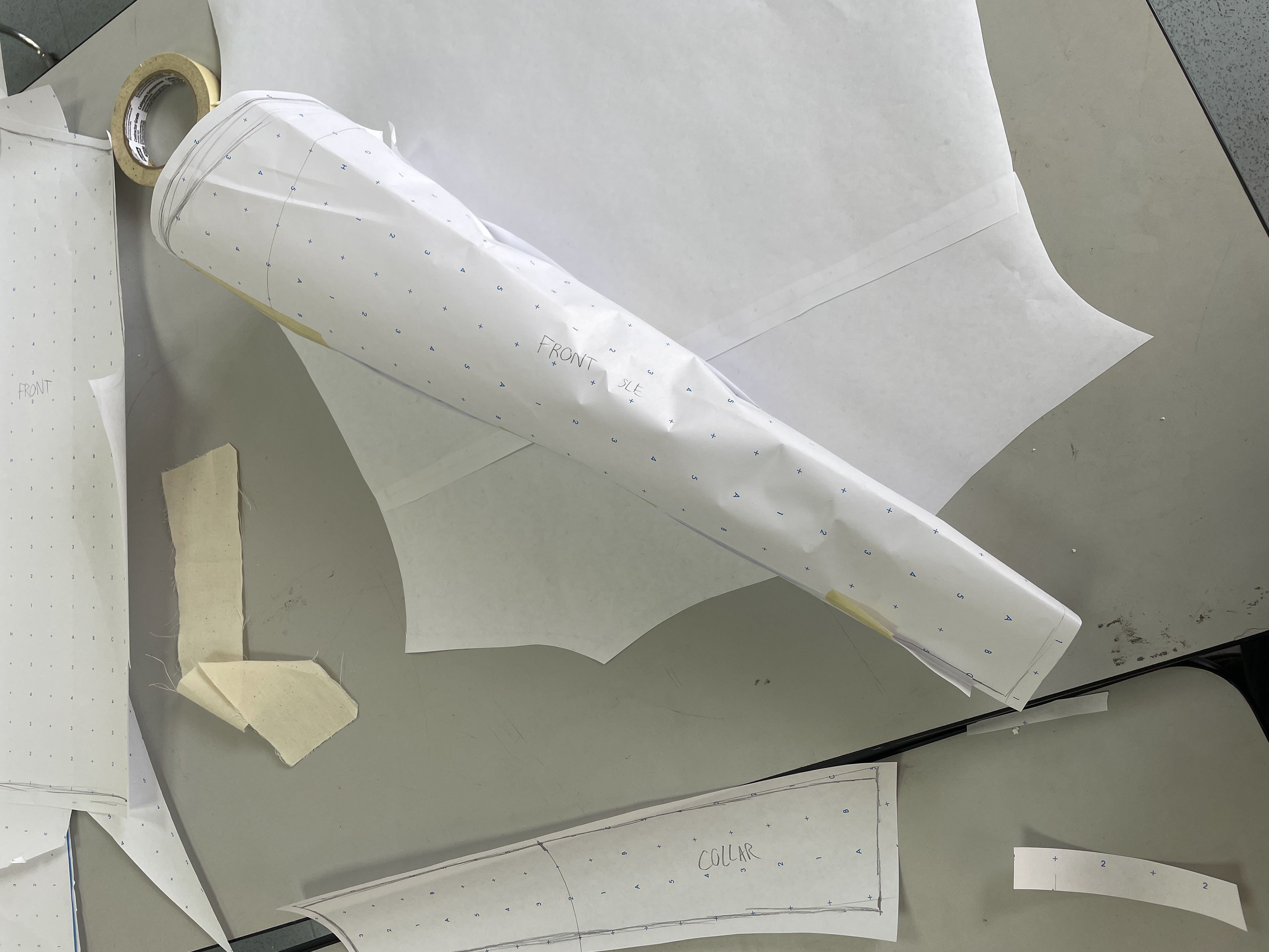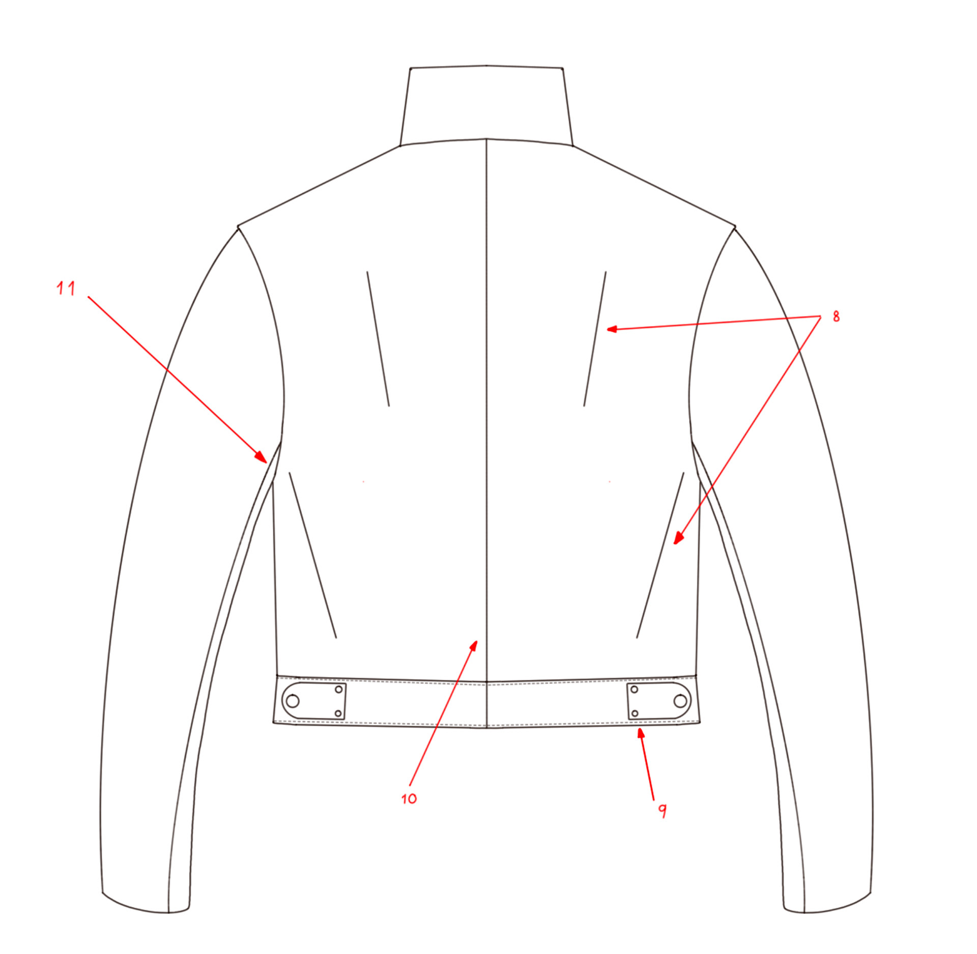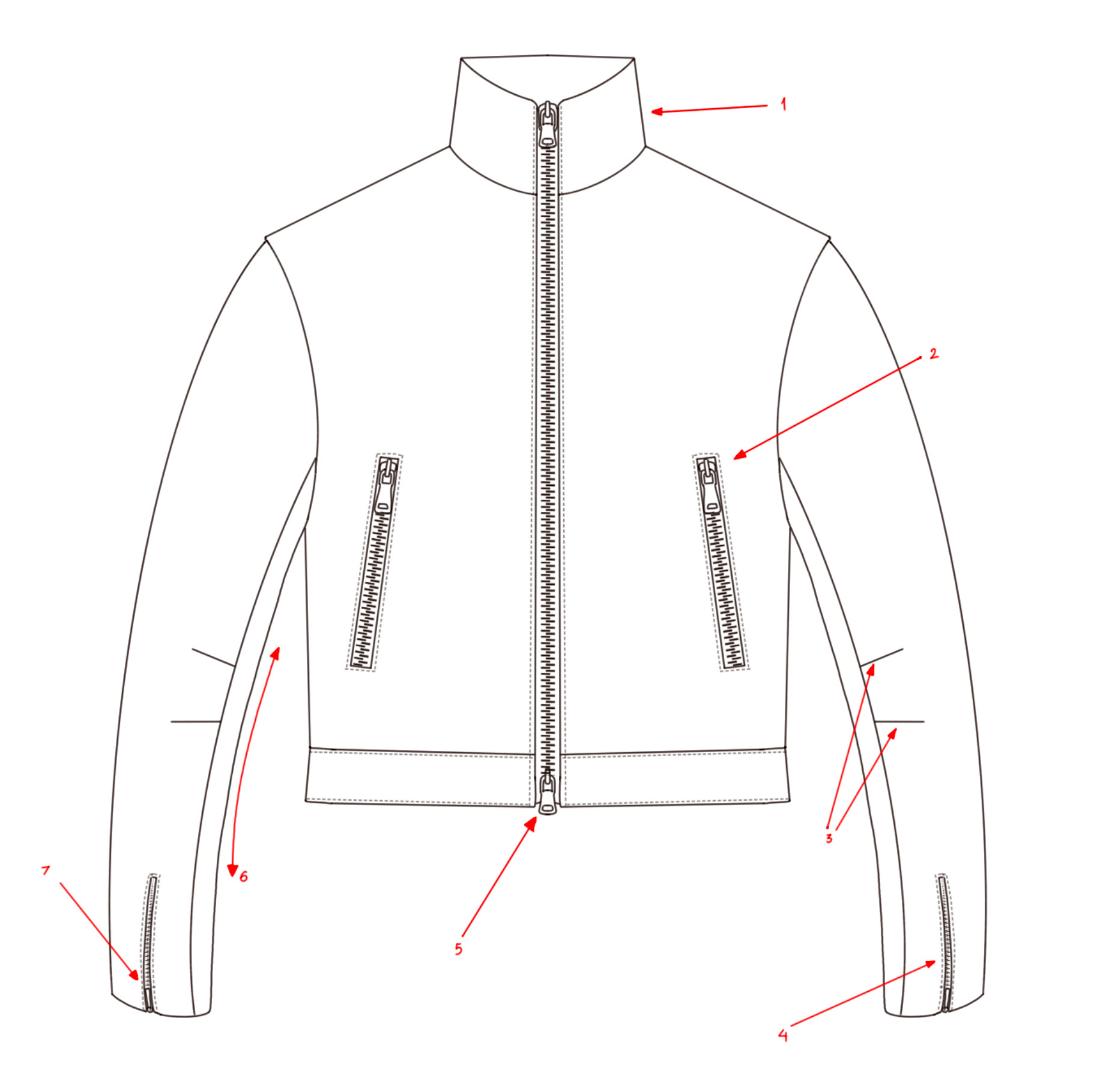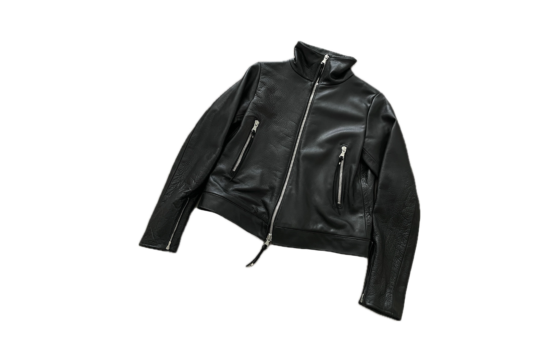 Calfskin leather, cropped body, J-cut sleeve, elongated neck, double zip, darts throughout. Design, patterned, and sewn by me.